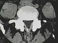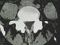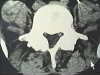 Bild 1: Normale CT. Bei den Hernien-ähnlichen Aufhellungen handelt es sich um die zwei abgehenden Spinalnerven.