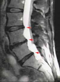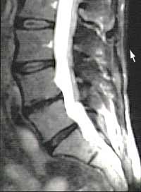 Beim MRI, auch Kernspintomographie genannt, werden im Gegensatz zum CT keine Röntgenstrahlen verwendet. Es kann die Wirbelsäule mit eventuellen Vorwölbungen der Bandscheiben in den Spinalkanal im Querschnitt und zusätzlich auch im Längsschnitt darstellen. Es ist vor allem in der Darstellung des Nervensystems und der Weichteile, also gerade der Bandscheiben und der Nervenwurzeln, dem CT überlegen.