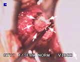 Leider kann der fibröse Ring nicht repariert und verstärkt werden. Es ist also möglich, dass später an der bereits einmal operierten Etage wieder Bandscheibenmaterial austreten kann. Wie schon erwähnt, ist es auch bei einer Operation nicht sicher, ob sich der betroffene Nerv je wieder ganz erholen wird. Ein Bandscheibenfragment von etwa einem cm Grösse - unter dem Mikroskop sieht es natürlich viel grösser aus - wird hier entfernt, und mit einer Sonde wird geprüft, ob der Nerv genügend Platz hat oder ob noch zusätzlich Knochen abgetragen werden muss (Bild 2)