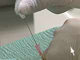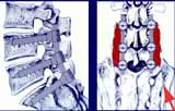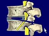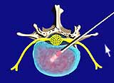 Beim Nervenwurzelblock ist der Patient wach und liegt auf dem Bauch. Zunächst wird die Einstichstelle unempfindlich gemacht, dann wird eine Führungsnadel eingebracht, durch welche die Spinalnadel - unter Kontrolle am Durchleuchtungs-Monitor - bis zum Nerv vorgeschoben wird. Es wird Kontrastmittel gespritzt um die Nervenwurzel darzustellen. Erst jetzt wird ein lokales Betäubungsmittel und eine kleine Menge Cortison injiziert. In vielen Fällen kann so auch bei grossen Diskushernien eine Operation vermieden werden. |