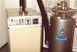 In akuten Fällen wird auch Kältetherapie mit Flüssigstickstoff angewendet. Rechts unsere erste Anlage, eine der ersten drei Anlagen, welche im Januar 1985 in die Schweiz importiert wurden. Sie hatte noch diverse Kinderkrankheiten (Vereisungen), tönte wie ein Staubsauger, und es musste jeweils zwischen den zwei 100 Liter Tanks umgeschaltet werden.