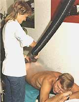 oder die Extension der Lendenwirbelsäule - auch Strecken genannt. Hier die Behandlung auf dem Extensomat mit in Hüft und Knie angewinkelten Beinen. Strecken, wenn richtig angewendet, sollte überhaupt keine Schmerzen verursachen.